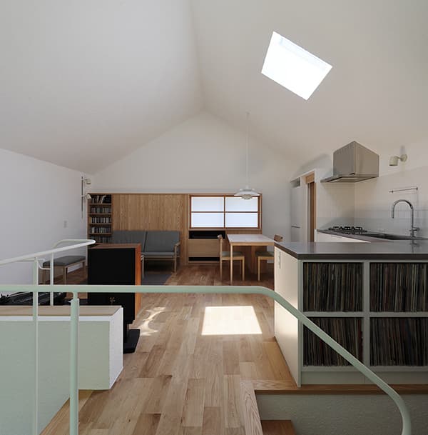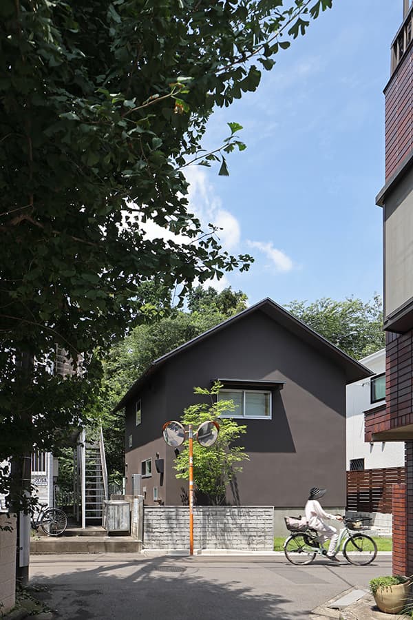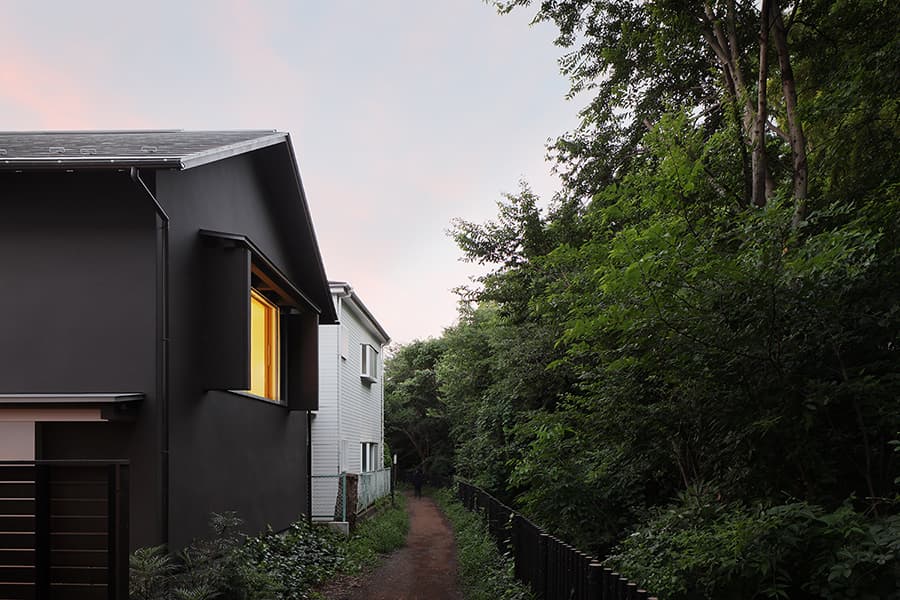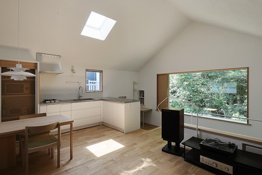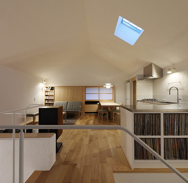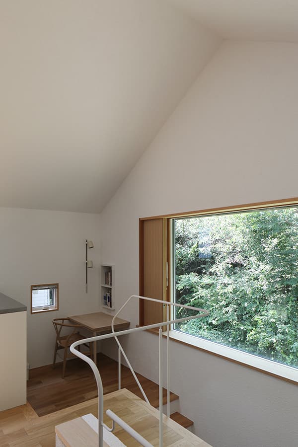 敷地面積は約23坪。建物は平面が3間x3間+440㎜で約9坪少々の木造二階建。外観は玉川上水沿いの樹々を背に日没前の一瞬、空の明るさと森の暗さの対比が生まれ闇の中にルネ・マグリットの絵画のようにひっそりと佇む小さくて可愛いらしい切り妻屋根の住まいをイメージした。内部は一階に和室(寝室)と水回りを設け、居間、食堂・台所を2階に配置。玄関は階段室と兼ねることで、コンパクトな家の中にも縦への広がりを生み出そうと考えた。また玉川上水の緑をダイナミックに取り込むよう西側に幅3mの大きな窓を設け、その窓に向かってソファを配置することで、まるで緑の奥から音楽が聞こえてくるような居場所をつくろうと考えた。階段室にも窓からの木刈が差し込み、階段室下の土間には木々の影が落ちてくる。階段室と和室の間は大きな障子で仕切られていて開け放つと敷居がベンチとなり、ここにも居場所が生まれている。階段の踊り場には机と小さな本棚をつくり書斎とした。窓からはやや死角になるこの場所は篭りながら仕事に集中できる場所になった。机の背面にはレコードをしまう棚がありキッチンと一体的にデザインされている。食堂は一人暮らしでもしっかりと料理ができるようにL字型に計画。ダイニングテーブルも合わせて計画することで使いやすさと美しさを両立するようにした。テーブル脇の窓の視線は道路の抜けと一致していて、ここでも心地よい広がりが与えられている。音楽を楽しむソファも、この住まいのために新たにデザインした。階段の手すりも機能面だけでなく音楽のような流れを感じられる形態とし、大きな窓の景色を邪魔しないよう高さの設定も工夫している。二階の空間は切妻屋根の形がそのまま室内の空間となり南側にトップライトを設けた。これは玉川上水の樹々によって西陽がかなり遮られることを考慮したためである。