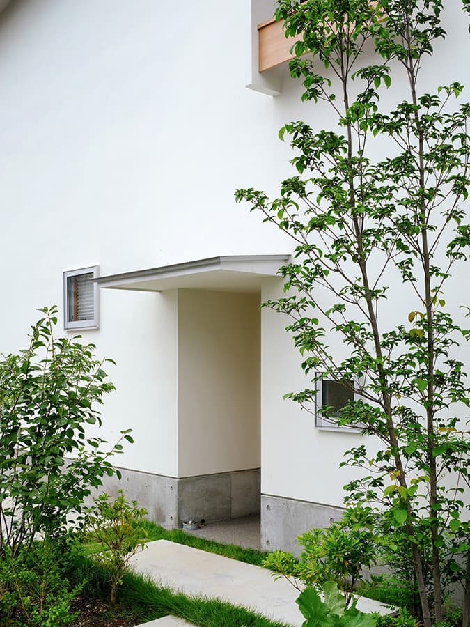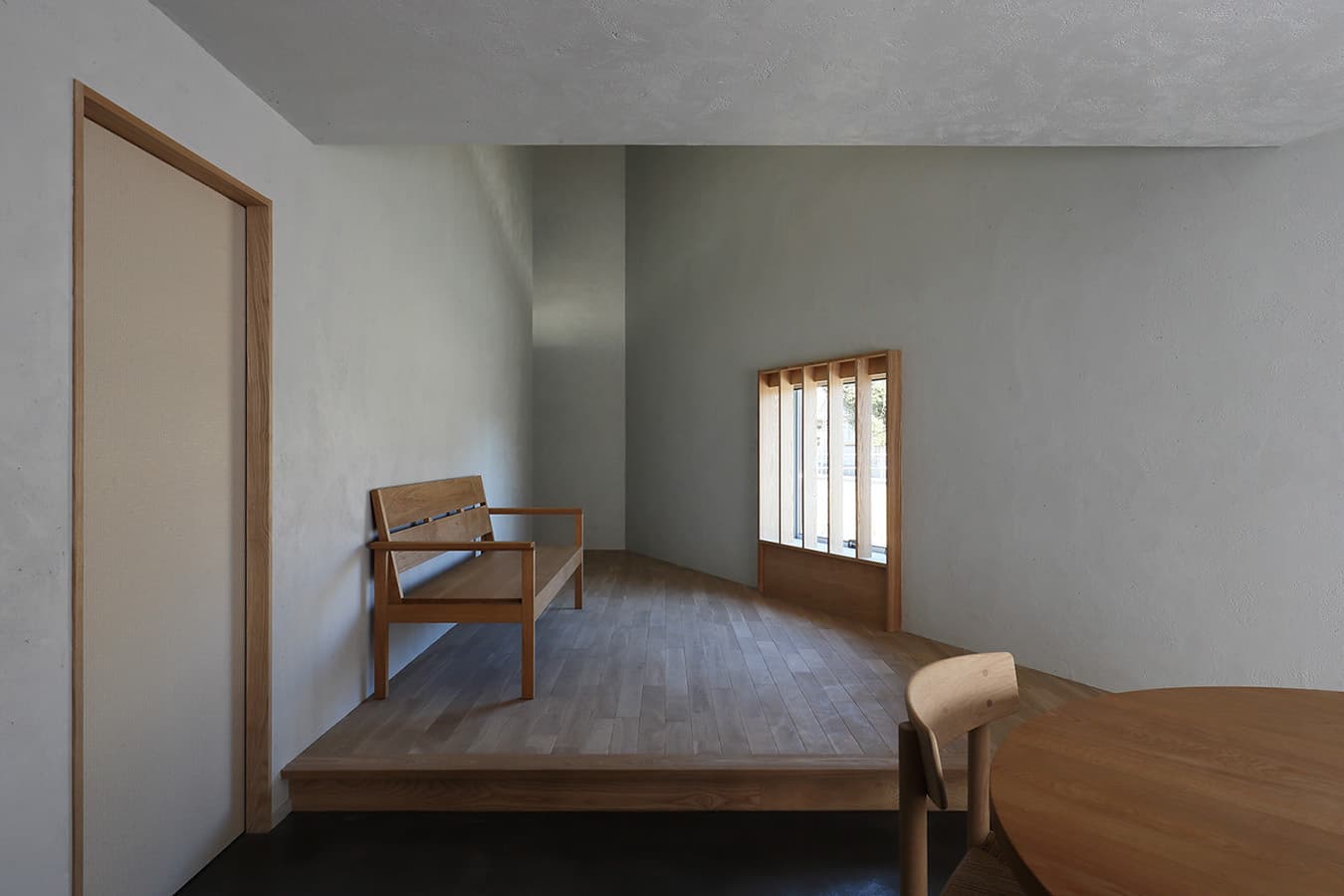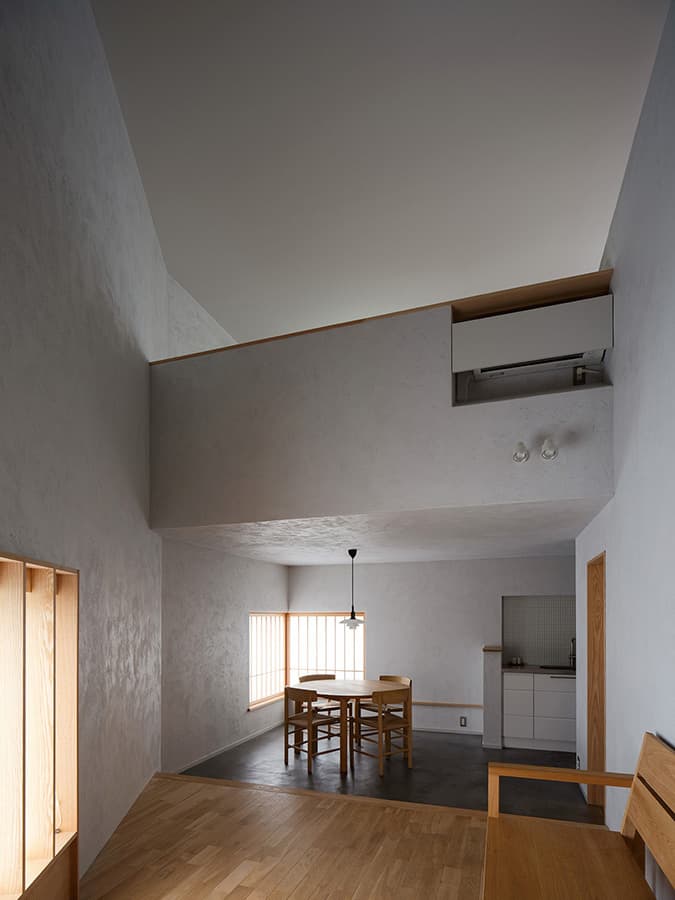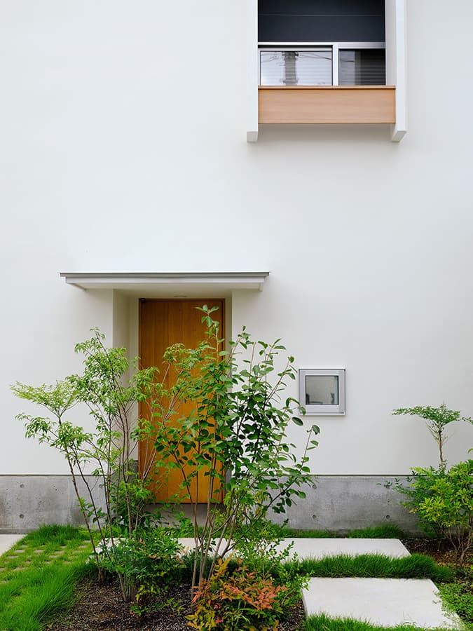 30代のご夫婦と小さな二人のお子さんのための住まいです。敷地は都心から約30分の私鉄駅を降り、駅前から続く美しいけやき並木を抜けた先にある住宅街の一画にあります。この辺りは未だに畑や雑木林が多く昔の武蔵野の風景が感じられる場所です。私が敷地を初めて訪れた時に、ここにはそっと地面に置かれたような「小さな佇まいの家」が良いと思いました。住まいとしての安心感を感じられる軒の出のある簡素な切妻屋根の箱。建物の周りに門や塀はつくらず敷地の余白を広がりのある庭とし、やがて建物が緑に包み込まれる、そんな姿の住まいを思い描いて設計をしました。内部はどこにいても小さな子供たちの気配を感じられるように、吹き抜けによって繋がる仕切りの無い一室空間としています。また景色の抜けが良い南東の角には食堂を配し、庭との繋がりを考えてコーナーの窓はフルオープンの木製引き戸としました。