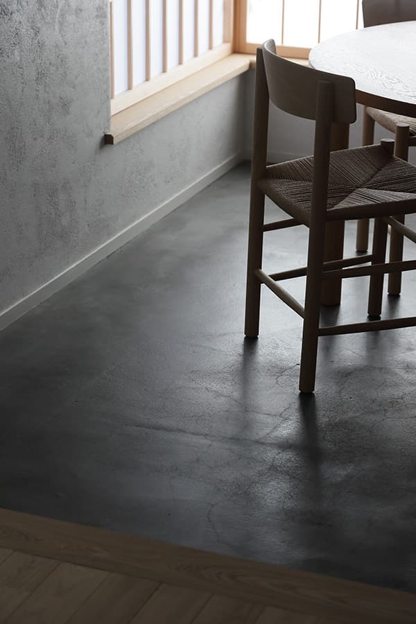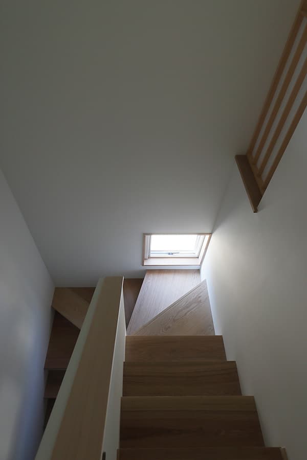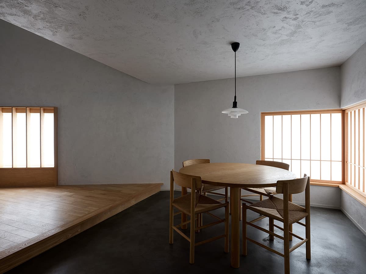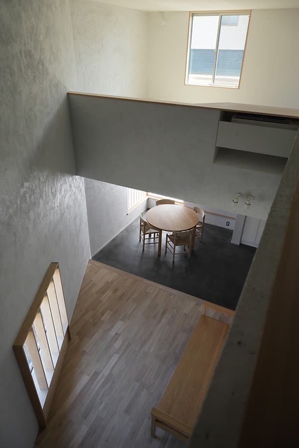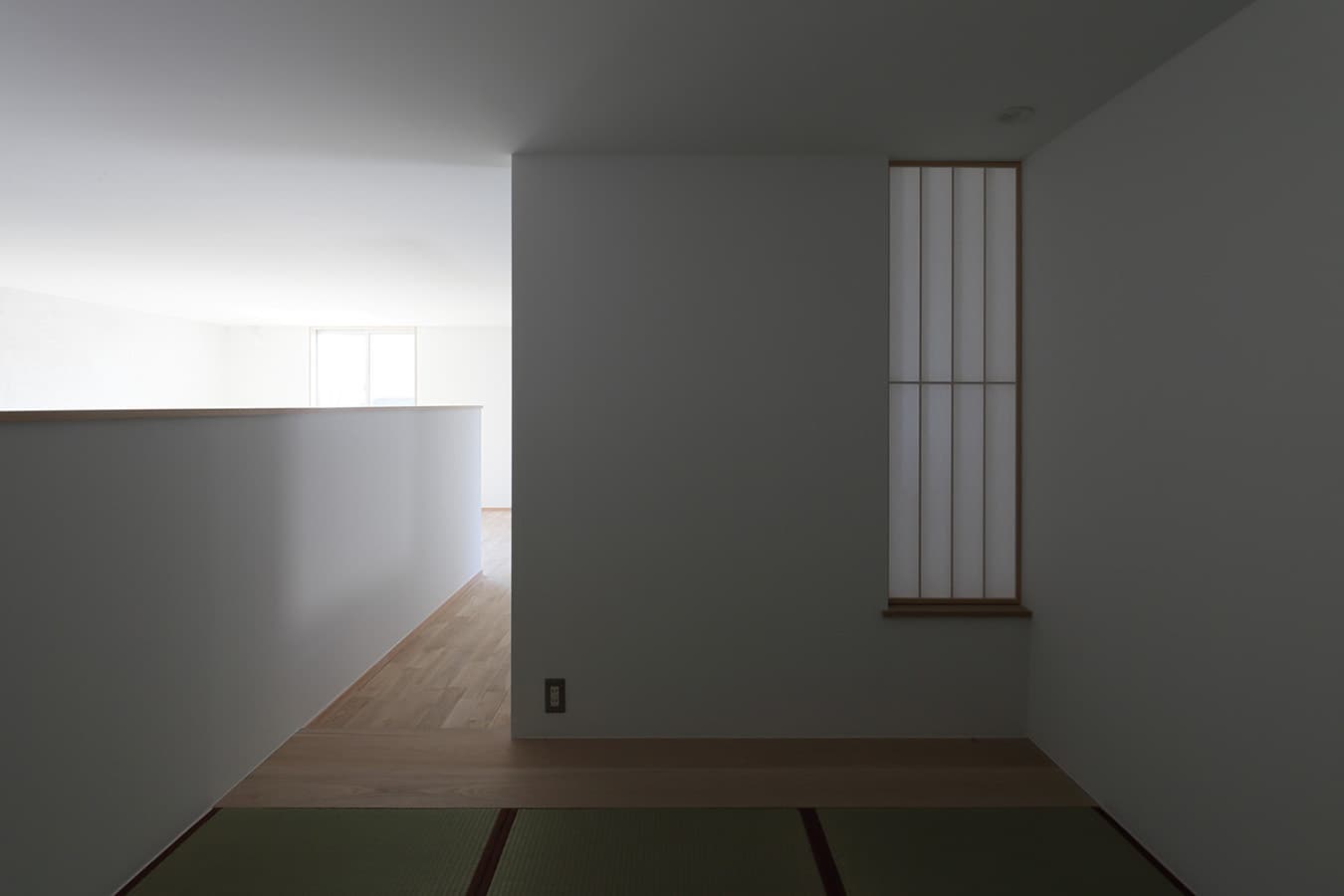 30代のご夫婦と小さな二人のお子さんのための住まいです。敷地は都心から約30分の私鉄駅を降り、駅前から続く美しいけやき並木を抜けた先にある住宅街の一画にあります。この辺りは未だに畑や雑木林が多く昔の武蔵野の風景が感じられる場所です。私が敷地を初めて訪れた時に、ここにはそっと地面に置かれたような「小さな佇まいの家」が良いと思いました。住まいとしての安心感を感じられる軒の出のある簡素な切妻屋根の箱。建物の周りに門や塀はつくらず敷地の余白を広がりのある庭とし、やがて建物が緑に包み込まれる、そんな姿の住まいを思い描いて設計をしました。内部はどこにいても小さな子供たちの気配を感じられるように、吹き抜けによって繋がる仕切りの無い一室空間としています。また景色の抜けが良い南東の角には食堂を配し、庭との繋がりを考えてコーナーの窓はフルオープンの木製引き戸としました。