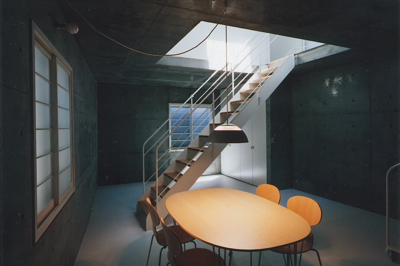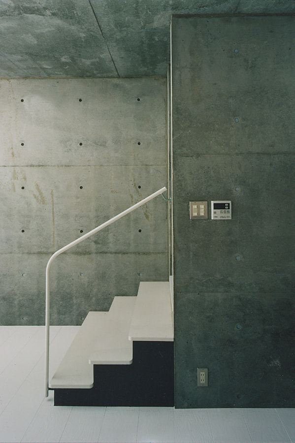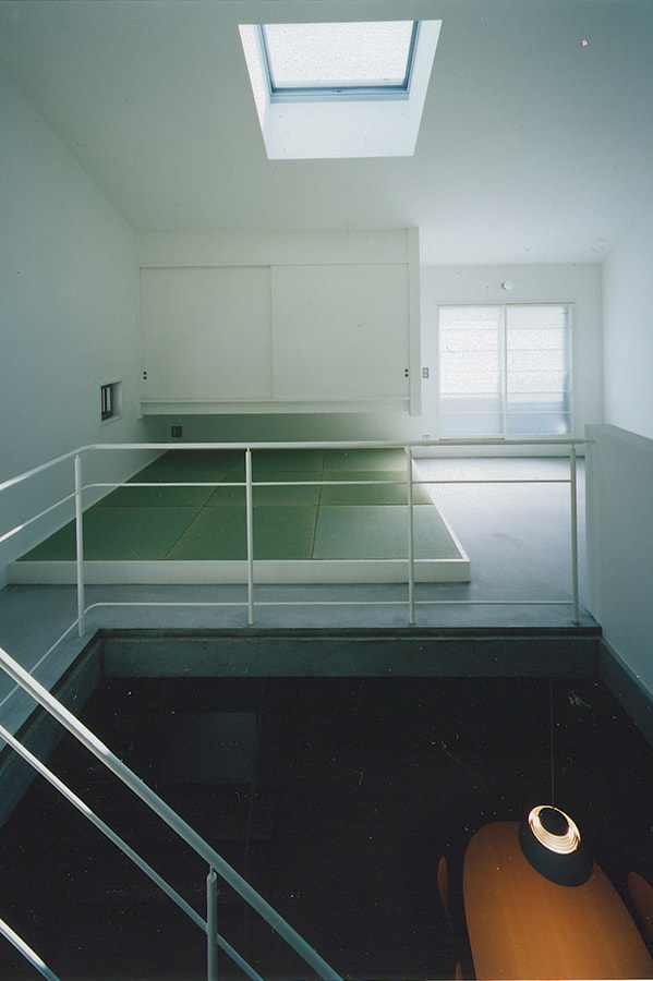中心に「大きな穴」のあるワンルーム。そこから光が降り注ぎ、風がぬける住まい。周りに見るべき風景が全くないので窓は最小限。代わりにトップライトが効果的な役目を果たしています。内部空間をできるだけ大きく取るために50センチほど建物が地下にもぐっています。”ころんとしたコンクリート”の箱の上に”木造の小屋”が載ったようなワンルーム。都市の中に埋め込まれたプリミティブな住居です。