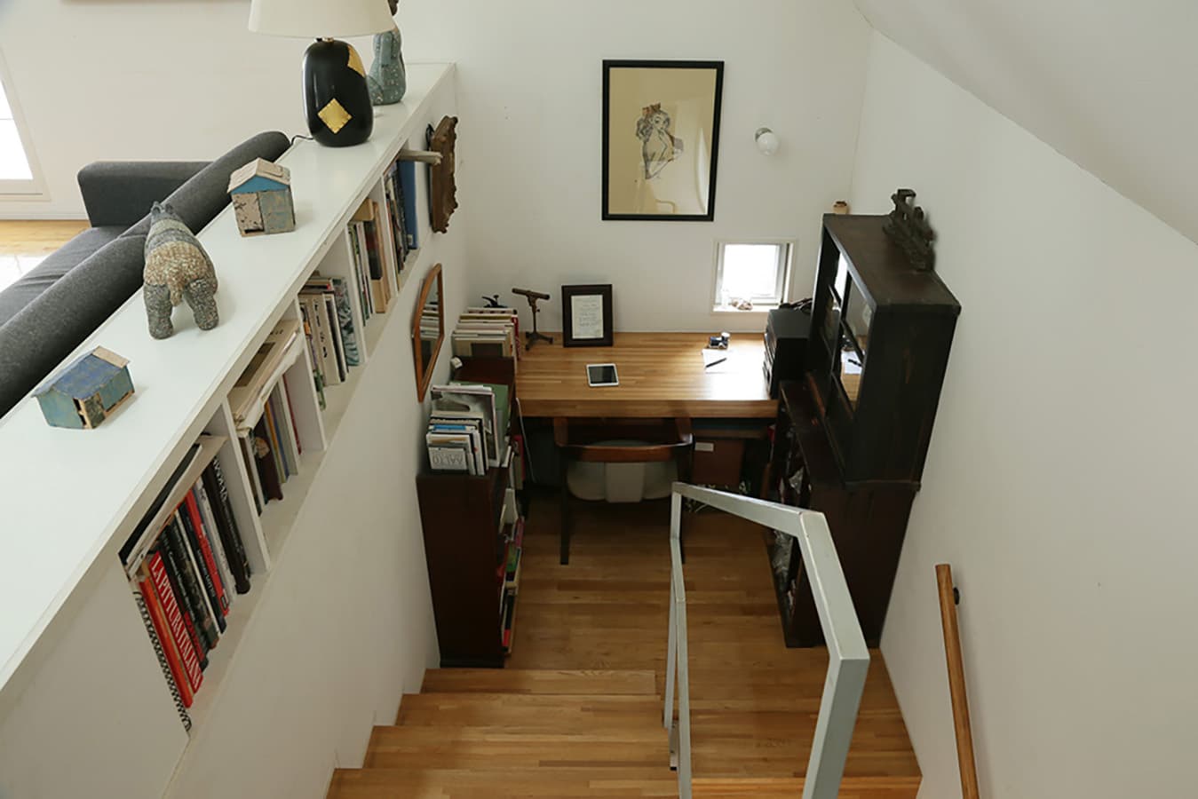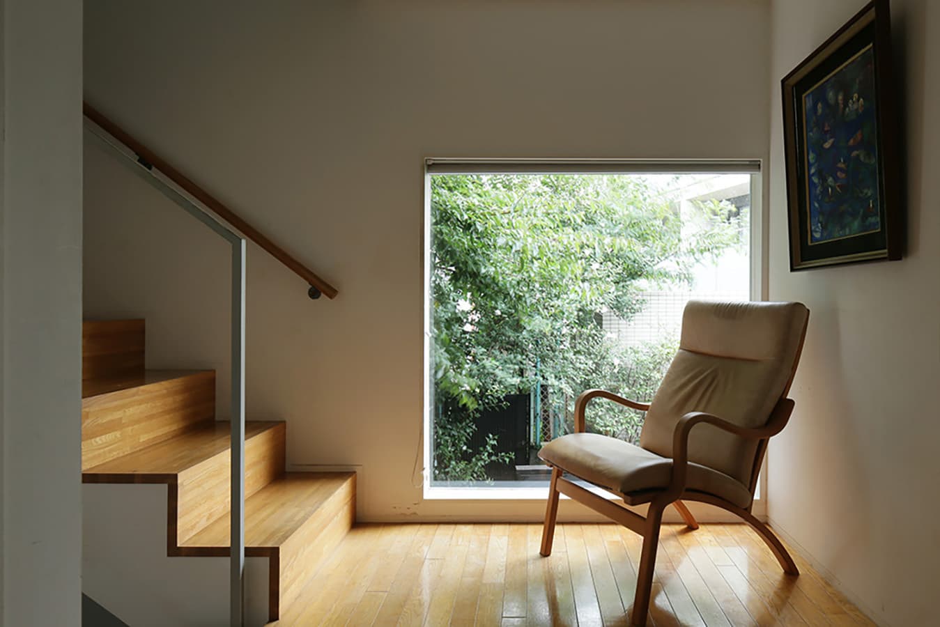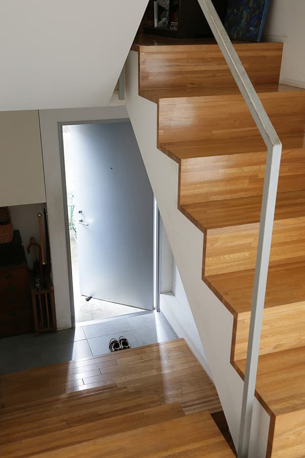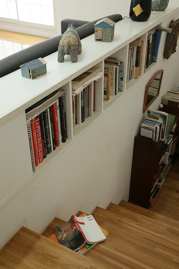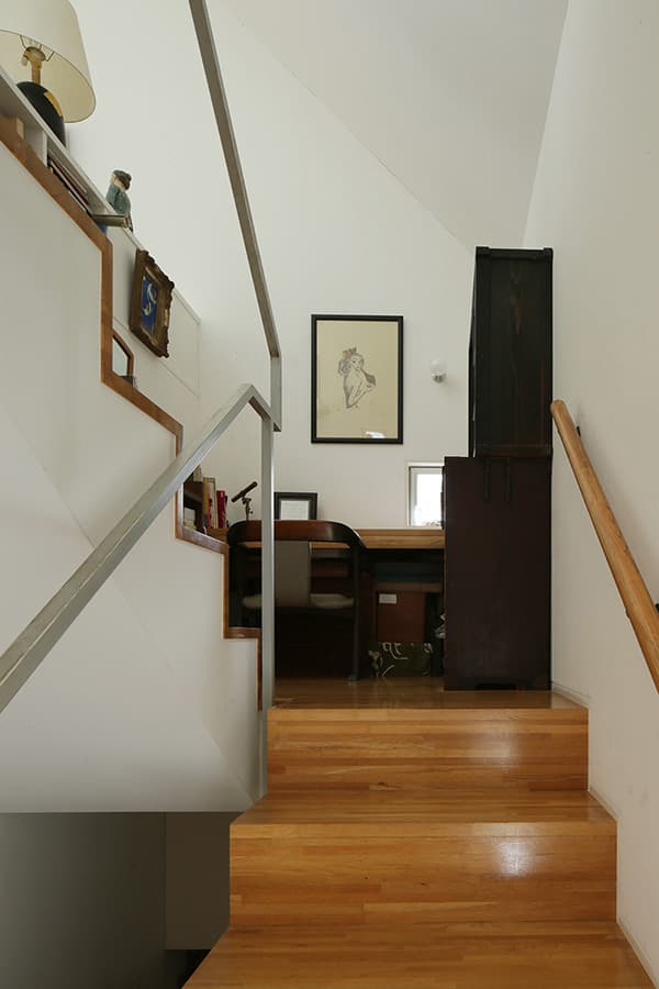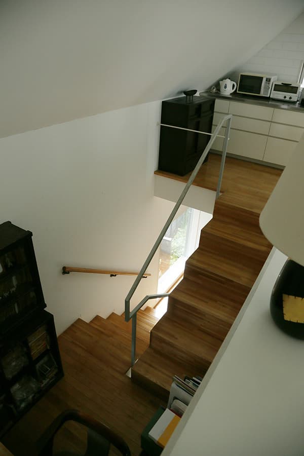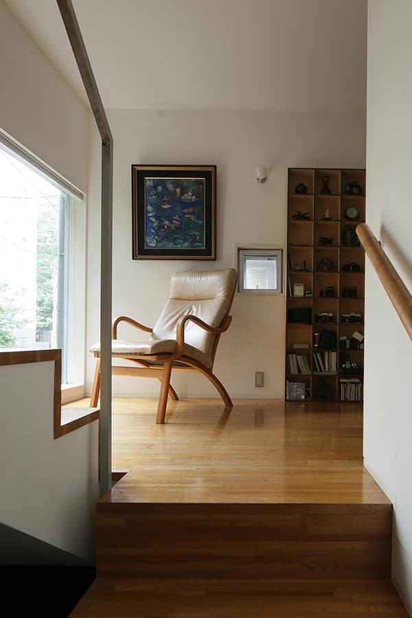 敷地が約20坪、建築面積が約10坪と都心に建つ小さな住宅です。ここでは家のあり方として部屋の大きさにこだわらず、むしろそこで行われる事…本を読んだり、手紙を書いたり、食事をしたり、といった事がストレス無く行われる事が大切ではないかと考えました。階段の踊場は書斎になり、階段はベンチに、廊下は縁側のような溜まりの場所として「どこにいても心地の良い家」を目指しています。