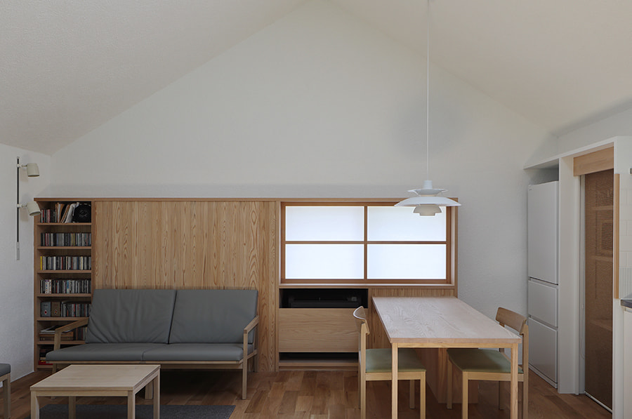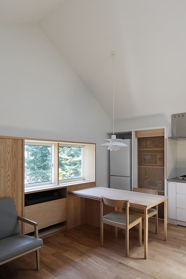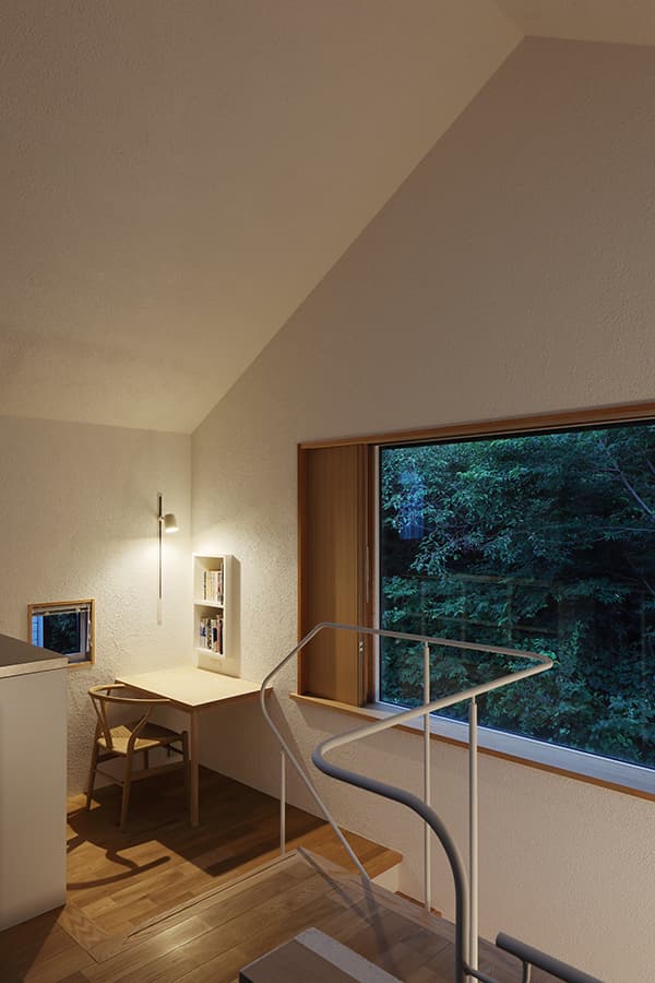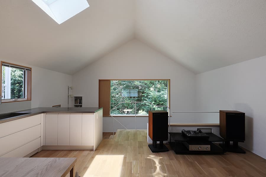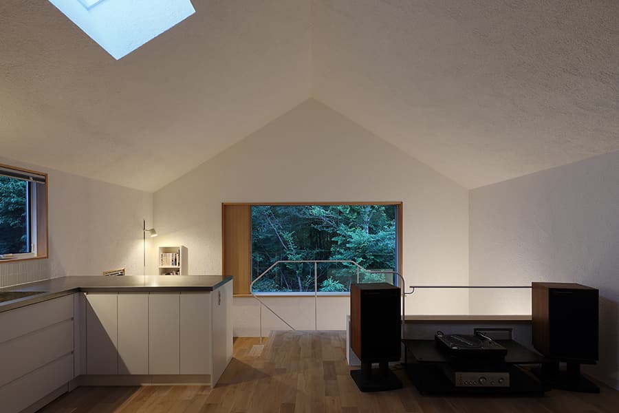 敷地面積は約23坪。建物は平面が3間x3間+440㎜で約9坪少々の木造二階建。外観は玉川上水沿いの樹々を背に日没前の一瞬、空の明るさと森の暗さの対比が生まれ闇の中にルネ・マグリットの絵画のようにひっそりと佇む小さくて可愛いらしい切り妻屋根の住まいをイメージした。内部は一階に和室(寝室)と水回りを設け、居間、食堂・台所を2階に配置。玄関は階段室と兼ねることで、コンパクトな家の中にも縦への広がりを生み出そうと考えた。また玉川上水の緑をダイナミックに取り込むよう西側に幅3mの大きな窓を設け、その窓に向かってソファを配置することで、まるで緑の奥から音楽が聞こえてくるような居場所をつくろうと考えた。階段室にも窓からの木刈が差し込み、階段室下の土間には木々の影が落ちてくる。階段室と和室の間は大きな障子で仕切られていて開け放つと敷居がベンチとなり、ここにも居場所が生まれている。階段の踊り場には机と小さな本棚をつくり書斎とした。窓からはやや死角になるこの場所は篭りながら仕事に集中できる場所になった。机の背面にはレコードをしまう棚がありキッチンと一体的にデザインされている。食堂は一人暮らしでもしっかりと料理ができるようにL字型に計画。ダイニングテーブルも合わせて計画することで使いやすさと美しさを両立するようにした。テーブル脇の窓の視線は道路の抜けと一致していて、ここでも心地よい広がりが与えられている。音楽を楽しむソファも、この住まいのために新たにデザインした。階段の手すりも機能面だけでなく音楽のような流れを感じられる形態とし、大きな窓の景色を邪魔しないよう高さの設定も工夫している。二階の空間は切妻屋根の形がそのまま室内の空間となり南側にトップライトを設けた。これは玉川上水の樹々によって西陽がかなり遮られることを考慮したためである。