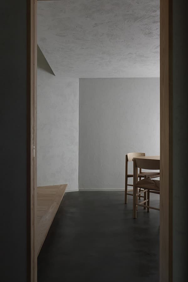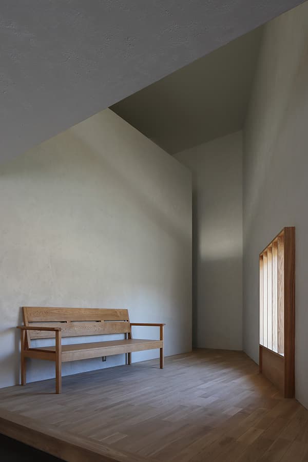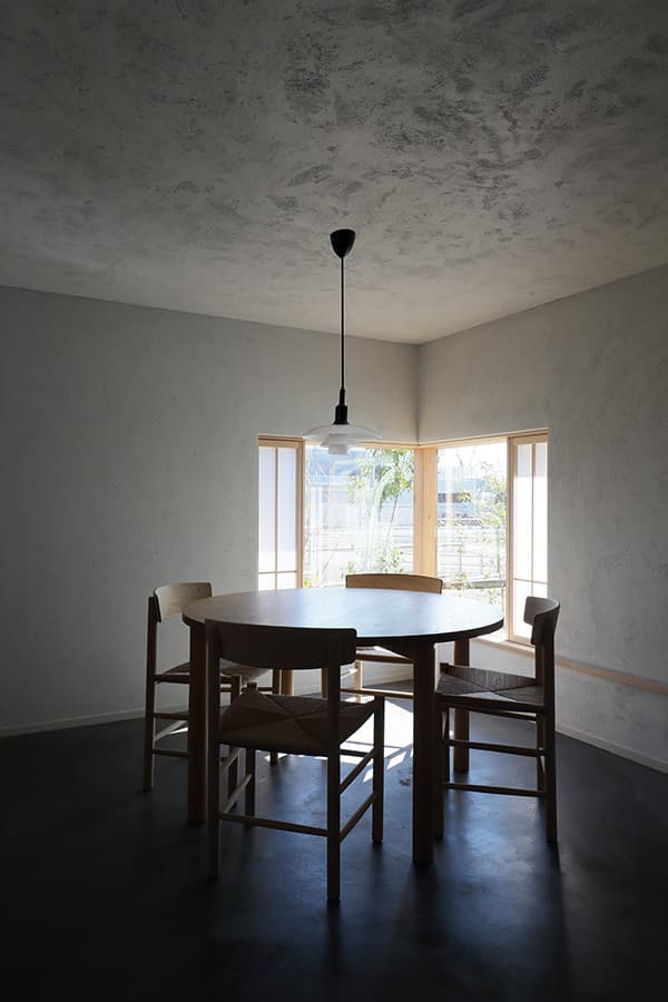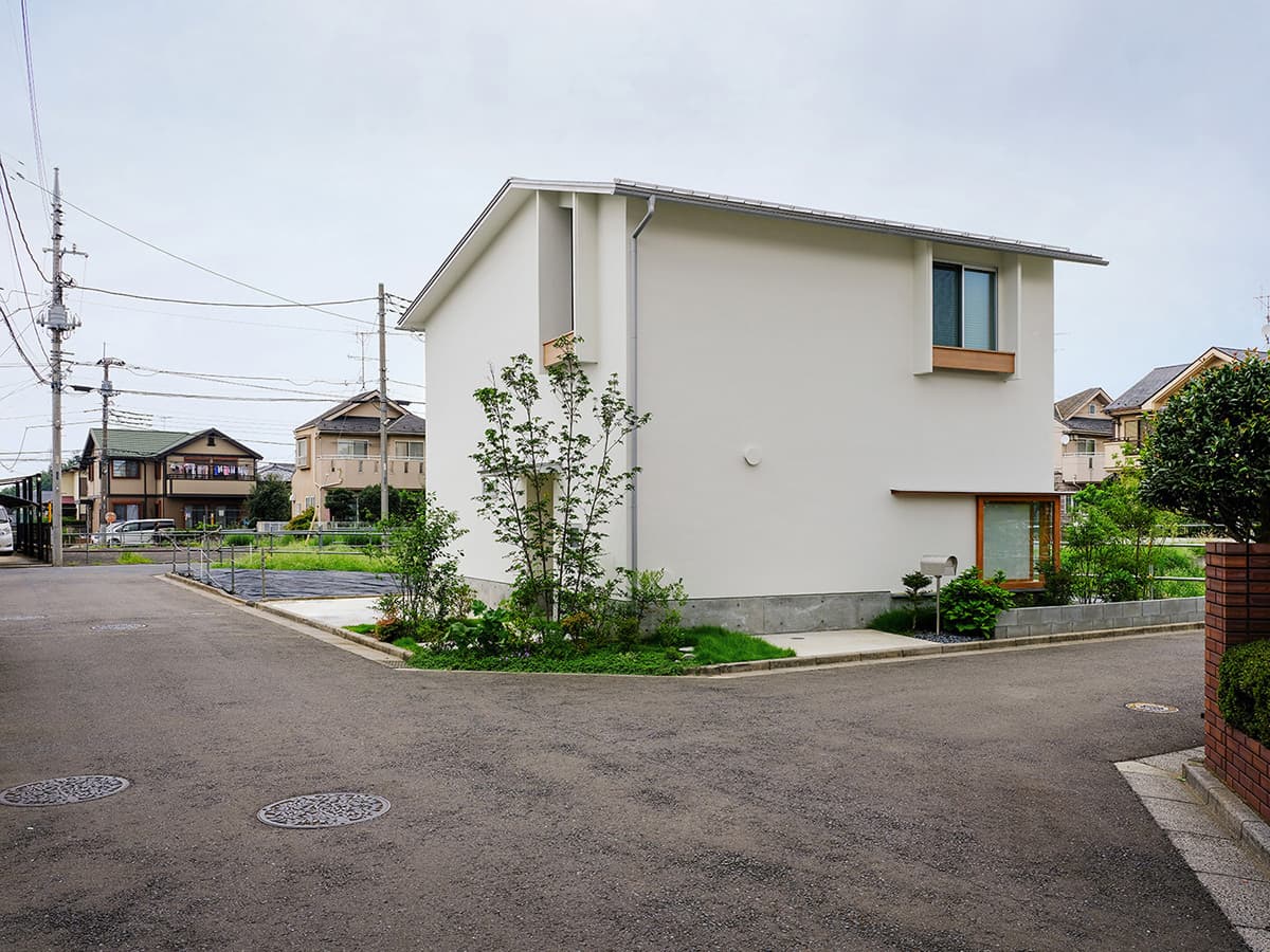 30代のご夫婦と小さな二人のお子さんのための住まいです。敷地は都心から約30分の私鉄駅を降り、駅前から続く美しいけやき並木を抜けた先にある住宅街の一画にあります。この辺りは未だに畑や雑木林が多く昔の武蔵野の風景が感じられる場所です。私が敷地を初めて訪れた時に、ここにはそっと地面に置かれたような「小さな佇まいの家」が良いと思いました。住まいとしての安心感を感じられる軒の出のある簡素な切妻屋根の箱。建物の周りに門や塀はつくらず敷地の余白を広がりのある庭とし、やがて建物が緑に包み込まれる、そんな姿の住まいを思い描いて設計をしました。内部はどこにいても小さな子供たちの気配を感じられるように、吹き抜けによって繋がる仕切りの無い一室空間としています。また景色の抜けが良い南東の角には食堂を配し、庭との繋がりを考えてコーナーの窓はフルオープンの木製引き戸としました。