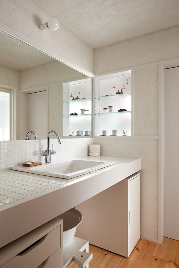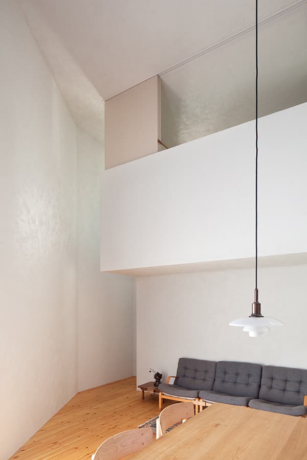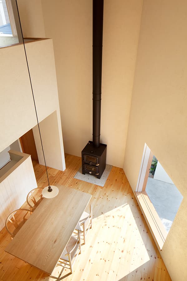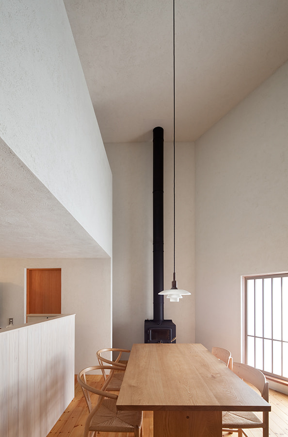 床はパインの無垢材、扉や窓も木製、壁、天井は全て「大谷石を混ぜた漆喰」としました。大谷石は自由学園のある、この地域にはとても馴染みの深い材料です。その表情は、弱い光の時に、ほんのり緑色に変化します。それが陰影のある空間に落ち着きを与え、さらに奥行きを生み出しています。