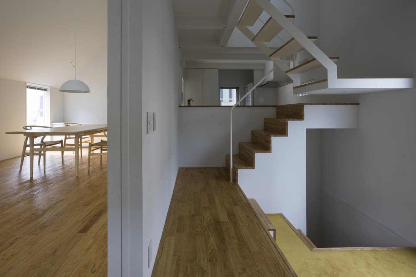 大きなワンルームの中心は台所。階段に面していてここが親子の交流の場所になっています。階段の奥のスペースは子供達の勉強スペース。3階の子供達の寝室とは別に設けました。あえて子供部屋を設けず子供達が居場所を移る事で、自然と親子の交流が生まれる事を意図しています。また、食堂と居間は大人の空間を維持するように計画しました。仕事から解放された時間にほっと落ち着くニュートラルな時間こそ、住宅の大切な機能だと考えています。