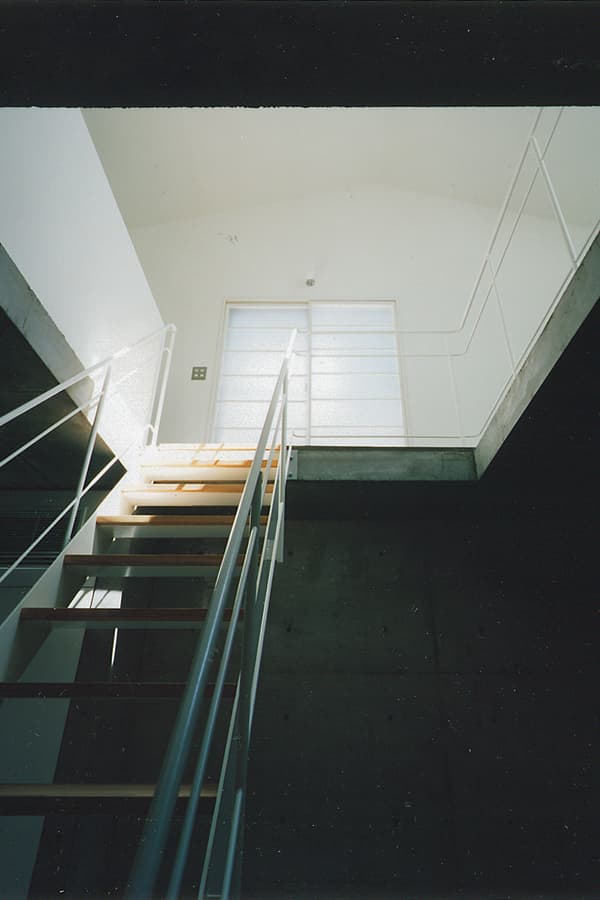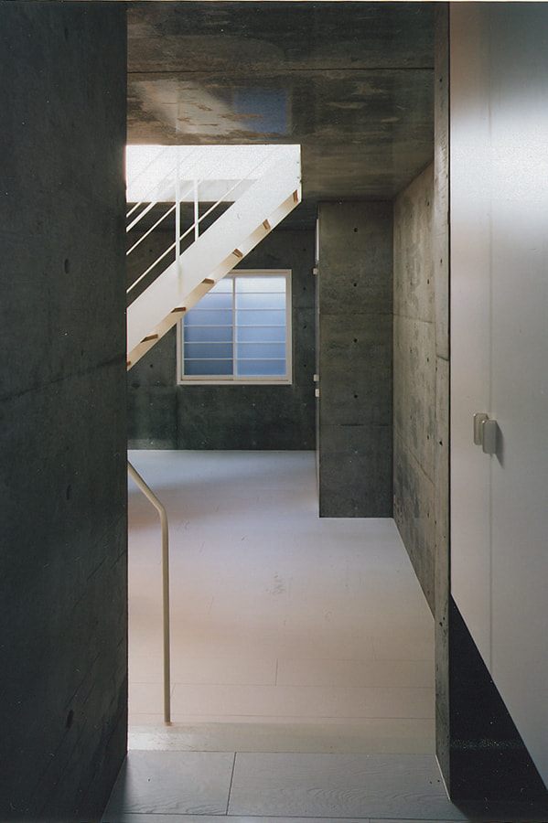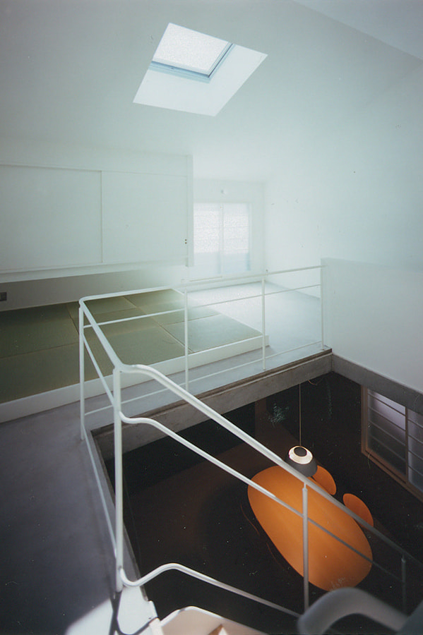 中心に「大きな穴」のあるワンルーム。そこから光が降り注ぎ、風がぬける住まい。周りに見るべき風景が全くないので窓は最小限。代わりにトップライトが効果的な役目を果たしています。内部空間をできるだけ大きく取るために50センチほど建物が地下にもぐっています。”ころんとしたコンクリート”の箱の上に”木造の小屋”が載ったようなワンルーム。都市の中に埋め込まれたプリミティブな住居です。