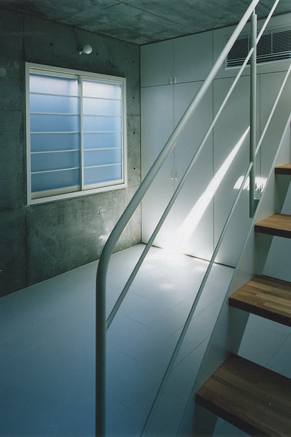 目黒区の閑静な住宅街に建つ住宅です。建築面積が10坪、延床面積でも20坪と本当に小さな規模ですが、ここに夫婦と二人の小さな子供の四人が暮らしています。設計の時に印象的だったのがご主人からのご要望でした。「例えて言うなら、避難所のようなガラんとした住まいがいいかな…」その言葉を受けて実施案がまとまりました。